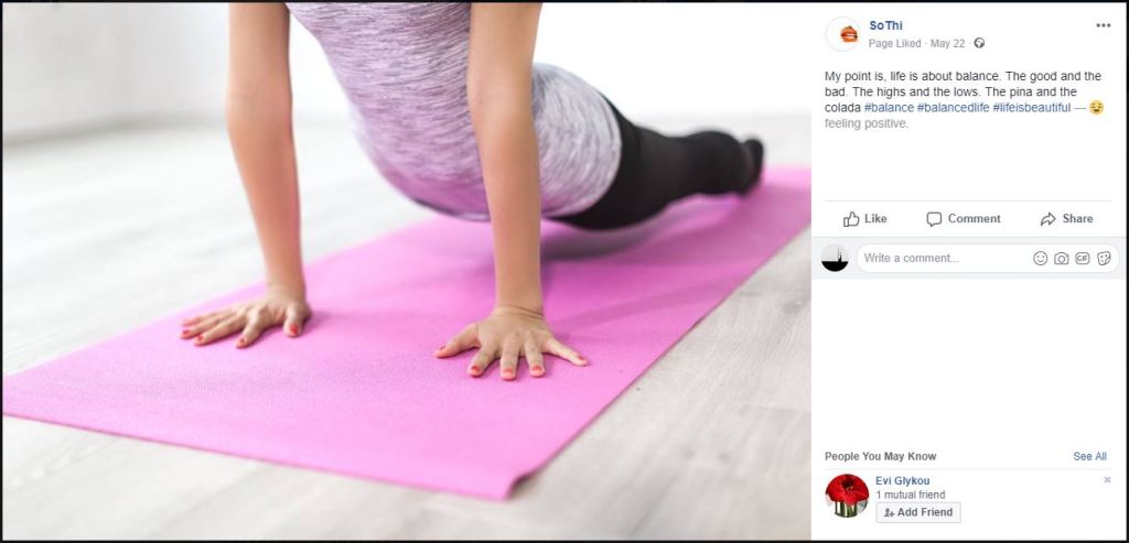 SoThi is a fictitious personality. Every post of the page is the result of internet searches of generic keywords in databases of public domain pictures and famous quotes. SoThi over-identifies with a stereotypical narcissistic behavior, by over-exposing their perfect life in an ideal world without problems.